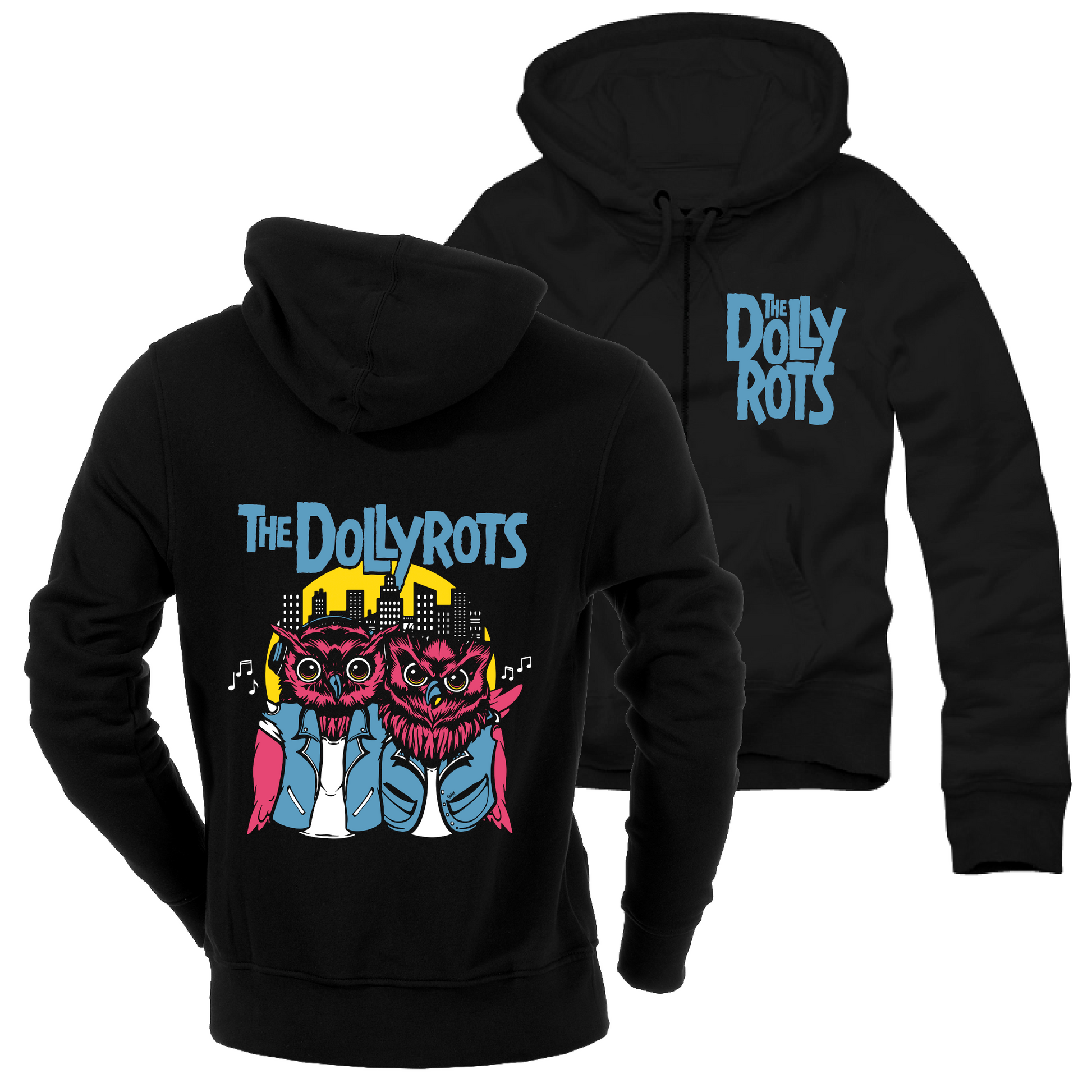 Brrrr! Getting chilly out there! Let us warm you up with your very own Night Owls hoodie! Super soft inside zip front. Featuring a couple pop punk night owls in their battle vests. We hope this will be your new favorite and that you'll wear it until the wrists get frayed and you lose the drawstring.